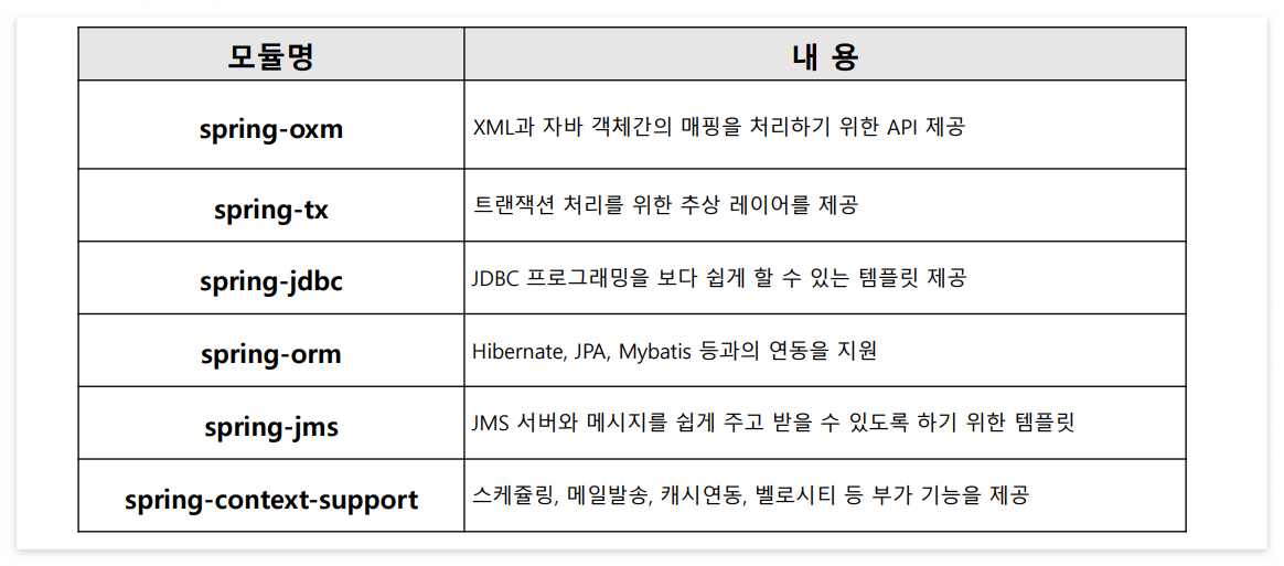 - JDBC나 데이터베이스에 연결하는 모듈로, Data 트랜잭션에 해당하는 기능을 담당하여 영속성 프레임워크의 연결을 담당한다.