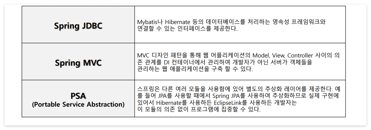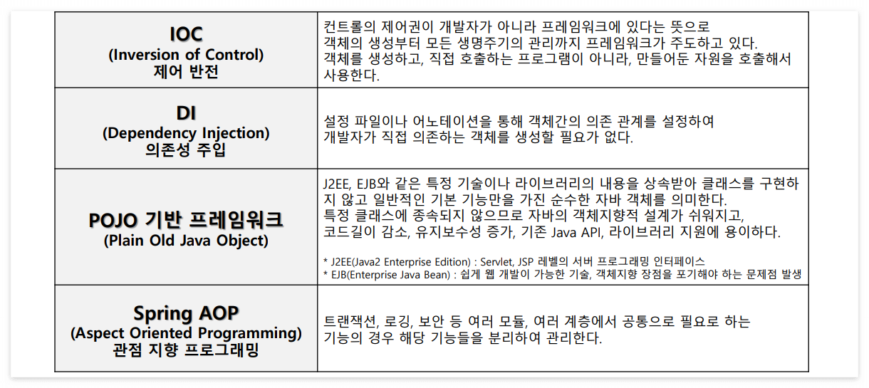 - 자바 플랫폼을 위한 오픈 소스 애플리케이션 프레임워크로 간단하게 스프링(Spring)이라고도 불린다. 동적인 웹 사이트를 개발하기 위한 여러 가지 서비스를 제공하고 있으며 대한민국 공공기관의 웹 서비스 개발 시 사용을 권장하고 있는 전자정부 표준 프레임워크(Spring MVC Project 기반 프레임워크) 의 기반 기술로서 쓰이고 있다.
