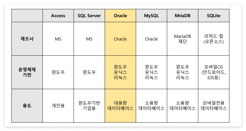 ✅ 관계형 데이터베이스 : 모든 데이터를 2차원 테이블 형태로 표현하고 테이블 사이의 비즈니스적 관계를 도출하는 구조 데이터의 중복을 최소화 할 수 있으며 업무 변화에 대한 적응력 우수